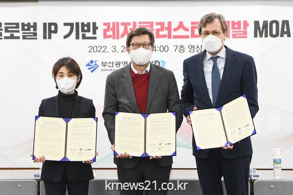 ▲ 사진=부산광역시부산시(시장 박형준)는 오늘(24일) 오후 시청에서 유한회사 아이피투오퍼레이션즈 홀딩(대표 로버트 하우벤, 이하 “iP2”), 유한회사 아이피투엔터테인먼트코리아 홀딩(대표 한정화, 이하 “iP2EK”)와 ‘글로벌 IP 기반 레저클러스터 개발을 위한 합의각서’를 체결했다고 밝혔다.