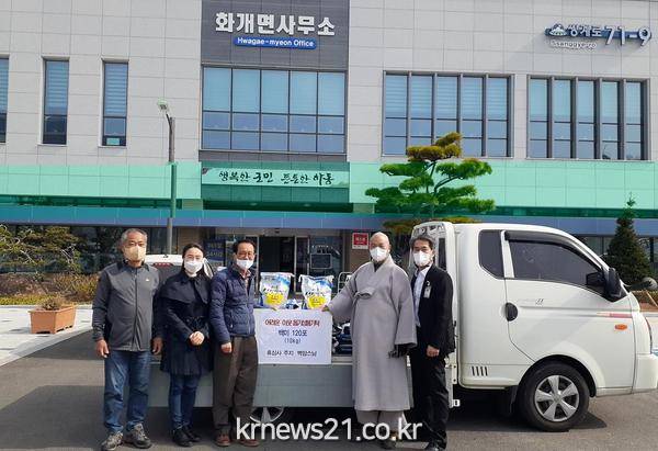 김재영 면장은 “코로나19로 모두가 힘든 상황에 매년 관내 어려운 이웃을 위해 백미를 기탁한 벽암 주지스님께 진심으로 감사드린다”며 “기부한 쌀은 지역 내 어려운 이웃에 잘 전하겠다”고 밝혔다.