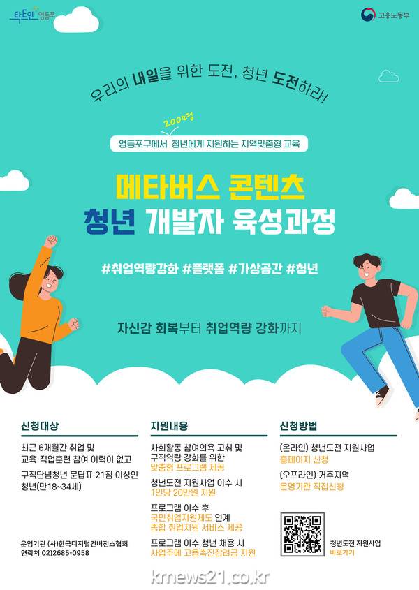 교육과 관련한 자세한 사항은 (사)한국디지털컨버전스협회(☎02-2685-0958)로 문의하거나 ‘영등포구 청년도전지원사업’ 네이버 블로그를 통해 확인할 수 있다.