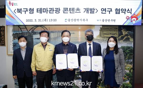 ▲ 사진=울산광역시 북구울산 북구는 31일 구청장실에서 울산연구원과 북구형 테마관광 콘텐츠 개발 연구 수행을 위한 업무협약을 체결했다.
