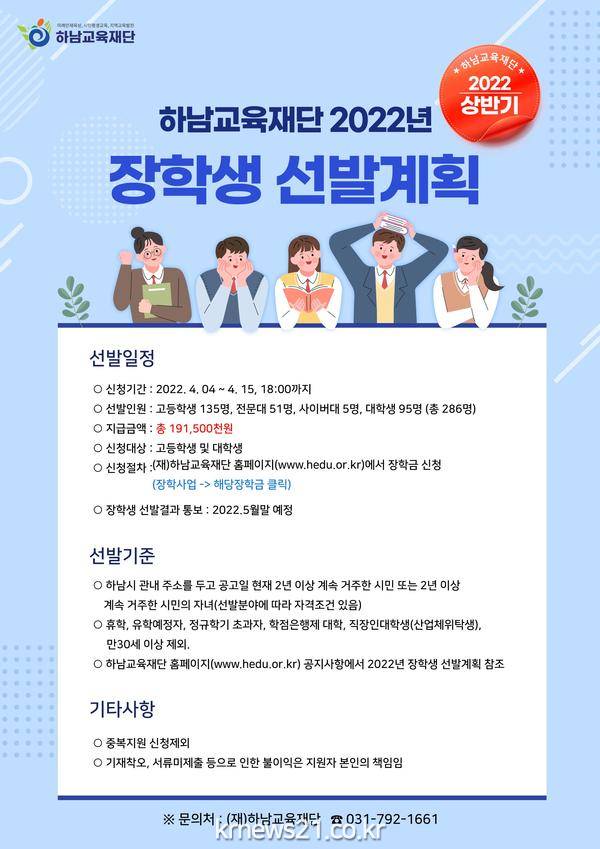 재단법인 하남교육재단(이사장 김상호 시장)은 ‘2022년도 상반기 장학생’을 오는 4월 15일까지 모집한다고 30일 밝혔다.