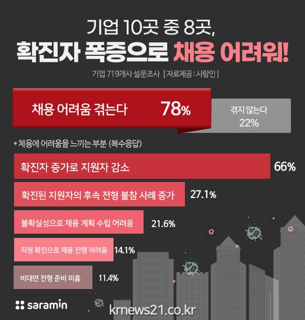 커리어테크 플랫폼 사람인(www.saramin.co.kr, 대표 김용환)이 기업 719개사를 대상으로 ‘코로나 확진자 폭증으로 인한 채용 어려움’을 조사한 결과, 78%가 ‘어려움을 느낀다’고 밝혔다.