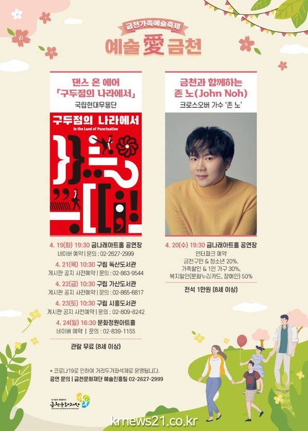 두 번째 프로그램은 4월 20일 크로스오버 가수 ‘존 노’의 공연이다. 금천지역 예술가인 존 노는 이날 피아노에 맞춰 데뷔 앨범 ‘NSQG’에 실린 주요 레퍼토리와 베토벤과 투리나의 가곡, 한국 가곡들을 선보일 예정이다.
