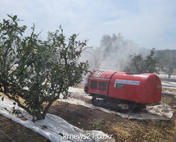 제주농업기술센터는 올해 사업비 8,000만 원(보조 5,600만 원, 자부담 2,400만 원)을 투입해 노지감귤원 5개소에 원격 조종으로 제어 가능한 이동형 병해충 무인방제기를 도입한다.