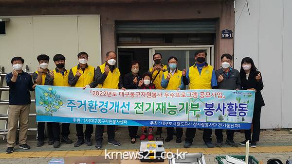▲ 사진=대구광역시대구도시철도공사 참사랑봉사단 전기통신지부는 대구시 동구자원봉사센터에서 주관하는 2022년 자원봉사 우수프로그램 공모사업에 ‘취약계층을 대상으로 전기시설물을 정비·보수하는 주거환경 개선사업’이 선정돼 올해 10월까지 총 7가구를 대상으로 주거개선 사업을 추진한다고 밝혔다.