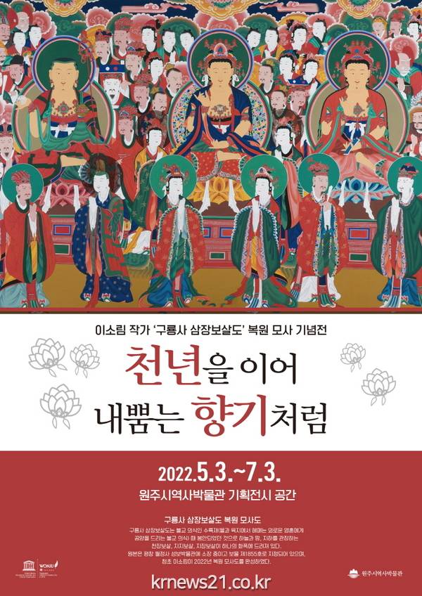 원주시역사박물관은 원주 출신의 지역 작가 청초 이소림의 구룡사 삼장보살도 복원 모사도를 선보이는 기획전시 「천년을 이어 내뿜는 향기처럼」을 개최한다고 밝혔다.