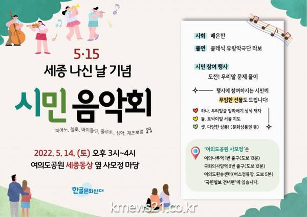 ▲ 사진=한글문화연대사단법인 한글문화연대(대표 이건범)에서는 5월 15일 세종대왕 태어난 날을 기념해 5월 14일 오후 3시부터 여의도공원 사모정 앞마당에서 거리공연 형식의 음악회를 연다.