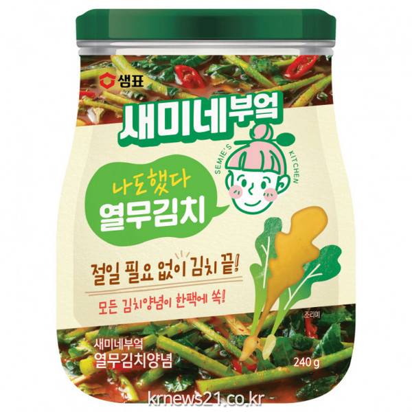 채소를 절이지 않고 고춧가루와 섞어 버무리기만 하면 김치가 완성되는 ‘새미네부엌 김치 양념’ 5종(△겉절이 △깍두기 △보쌈김치 △부추 파김치 △오이소박이)에 이어 열무김치 양념을 추가로 선보였다.