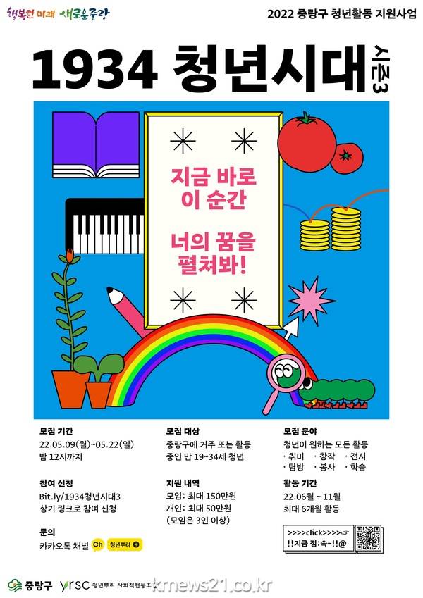 ▲ 사진=중랑구중랑구는 자유 주제로 어떤 것이든 도전할 수 있는 청년활동 지원사업인 ‘1934 청년시대’ 참여자를 오는 22일까지 모집한다.