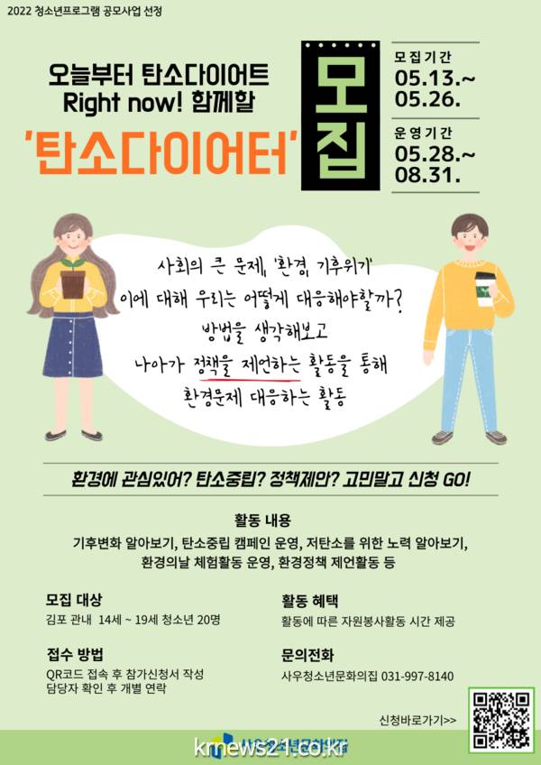(재)김포시청소년재단 사우청소년문화의집은 2022년 여성가족부 청소년프로그램 공모사업 ‘오늘부터 탄소다이어트 Right now!’ 프로그램 참가자(탄소다이어터)를 모집한다고 밝혔다.