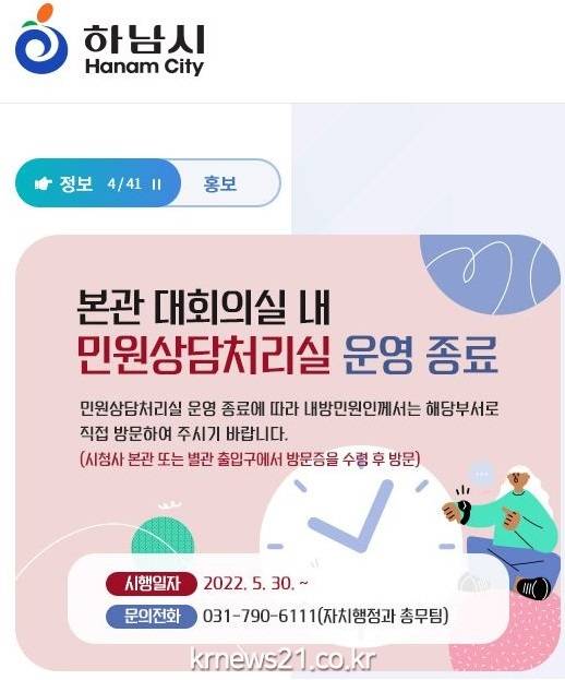하남시는 오는 30일부터 모든 민원업무를 해당 부서에서 직접 처리할 예정이라고 밝혔다. 이에 따라 시청 본관 1.5층 대회의실에 설치된 기존 민원상담처리실은 이달 27일까지만 운영한다.