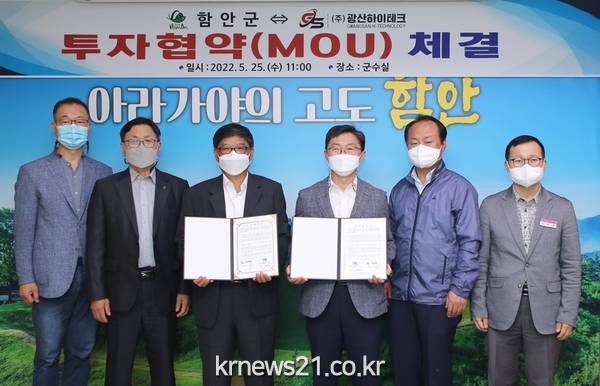 ▲ 사진=함안군청함안군은 25일 오전 11시 군수실에서 ㈜광산하이테크와 110억 규모의 투자협약(MOU)을 체결했다.