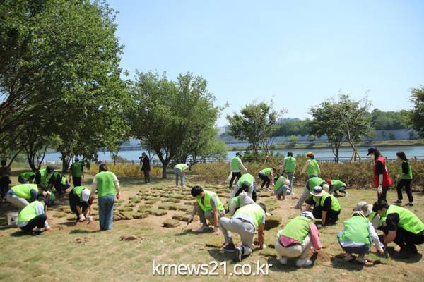 이날 골프존 임직원 40여명은 이촌한강공원 골프존숲에 조팝나무를 심고, 잔디를 심는 봉사활동을 진행했다.