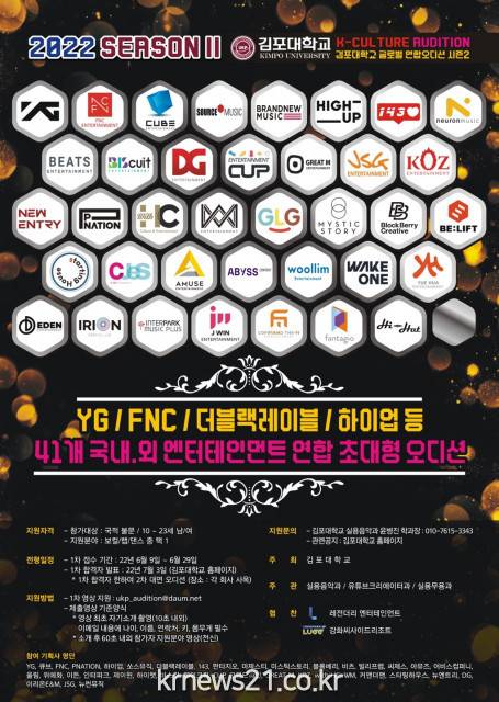 이번 ‘김포대학교 K-Culture 연합 오디션 시즌2’의 오디션은 2022년 6월 9일부터 6월 29일까지 영상 지원을 거쳐 이뤄진다. 7월 3일에는 1차 비대면 영상 오디션 합격자를 발표하고, 7월 중에 기획사별로 2차 대면 오디션을 진행한다.