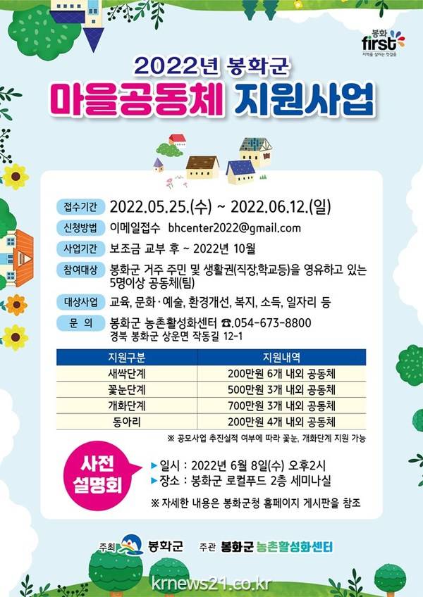 신청 기간은 6월 12일까지이며, 봉화군에 거주하면서 5인 이상의 공동체는 누구나 신청 가능하다.