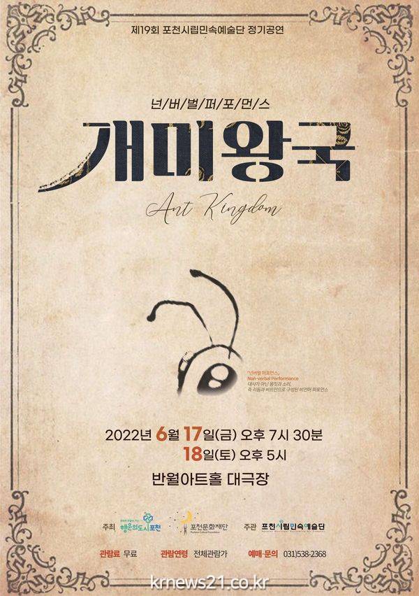 포천시립민속예술단은 오는 17일부터 18일 이틀간 포천반월아트홀 대극장에서 제19회 정기공연 ‘개미왕국’을 선보인다.
