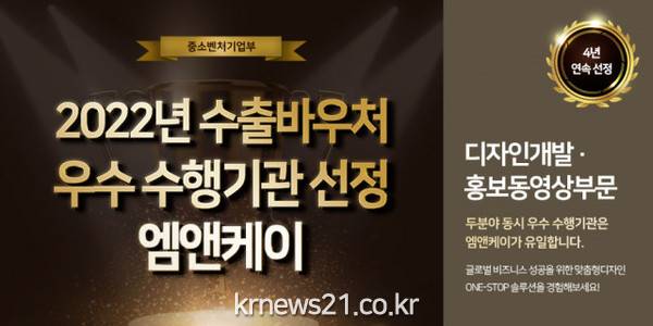 엠앤케이는 2019년부터 연속으로 홍보 동영상 우수 수행기관으로 선정됐으며, 올해 디자인 개발 부분 우수 수행기관으로 선정되면서 국내 최초로 동영상&디자인 개발 부분 우수 수행기관 타이틀을 거머쥐게 됐다.