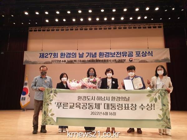 하남시 푸른교육공동체는 16일 ‘제27회 환경의 날 기념 환경보전유공 포상식’에서 대통령 표창을 수상했다고 밝혔다.