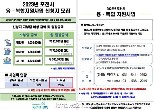 사업은 포천시, 신재생에너지 설비 시공업체, 모니터링, 감리 업체 등으로 컨소시엄을 구성해 추진한다. 자세한 사항은 컨소시엄 콜센터(031-544-0252) 또는 포천시 친환경정책과(031-538-2249)로 문의하면 된다.
