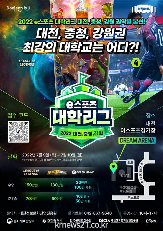 ▲ 사진=대전시대전시와 대전정보문화산업진흥원(이하 진흥원)은 2022년 전국 최고 이스포츠 대학을 가리는 ‘2022 이스포츠 대학리그’ 충청 · 강원권 대회가 7월 9일과 10일 대전 이스포츠 경기장에서 열린다고 밝혔다.