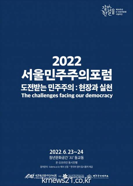 ▲ 사진=민주화운동기념사업회국제 민주주의 동향을 짚고 국제 협력과 연대의 방안을 모색하는 ‘2022 서울민주주의포럼’이 6월 23일과 24일 이틀에 걸쳐 청년문화공간 JU에서 온·오프라인 동시 개최된다.