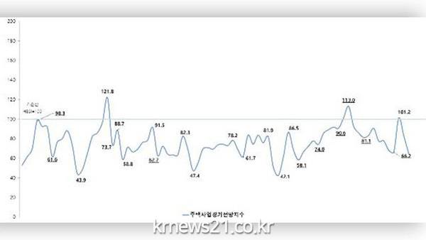 주택산업연구원은 한국주택협회와 대한주택건설협회 회원사 500여 곳을 대상으로 주택건설 사업의 체감경기를 설문 조사한 결과 이번 달 전국 경기전망 지수가 64.1로 지난달(82.6)보다 18.5포인트 떨어졌다고 밝혔다.