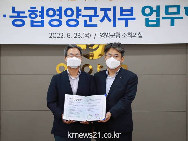 ▲  사진=영양군영양군(군수 오도창)과 농협영양군지부(지부장 윤석우)는 2022. 6. 23.(목) 영양군청 소회의실에서 고향에 기부하여 혜택 받고, 내 고향 살리는 고향사랑기부제 업무 협약을 체결했다.