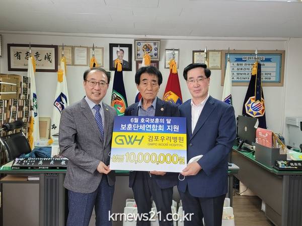 ▲ 사진=김포시김포우리병원(원장 고도현)은 6월 호국보훈의 달을 맞아 지역 내 국가유공자 및 보훈가족들의 희생과 헌신에 감사하는 마음을 담아 김포복지재단을 통해 김포시보훈단체연합회에 성금 1천만 원을 기부했다.
