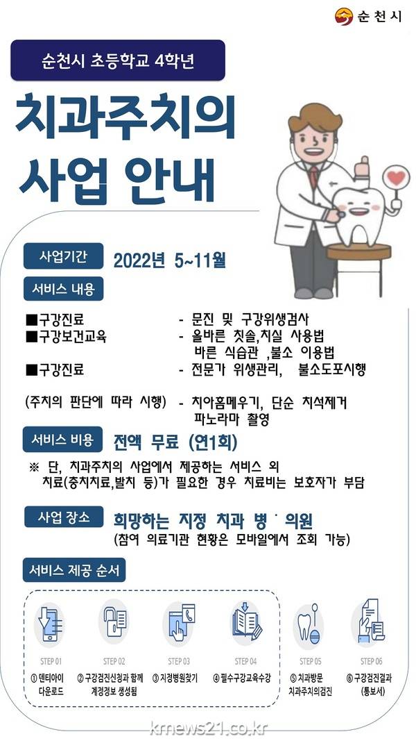 이 사업은 순천시 보건소와 지역 치과 병·의원이 협력해 영구치아 배열이 완성되는 시기에 구강건강 행태 개선효과가 높은 초등학교 4학년을 대상으로 평생 구강건강의 기초가 되는 예방중심의 포괄적 구강건강관리사업이다.
