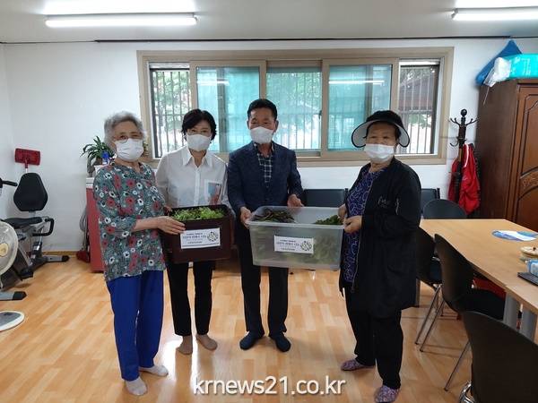 ▲ 사진=군포시군포시 군포1동 주민자치회는 6월 27일 군포1동 행정복지센터 옥상텃밭에서 수확한 상추와 오이 등 농작물을 관내 효자경로당에 전달했다.
