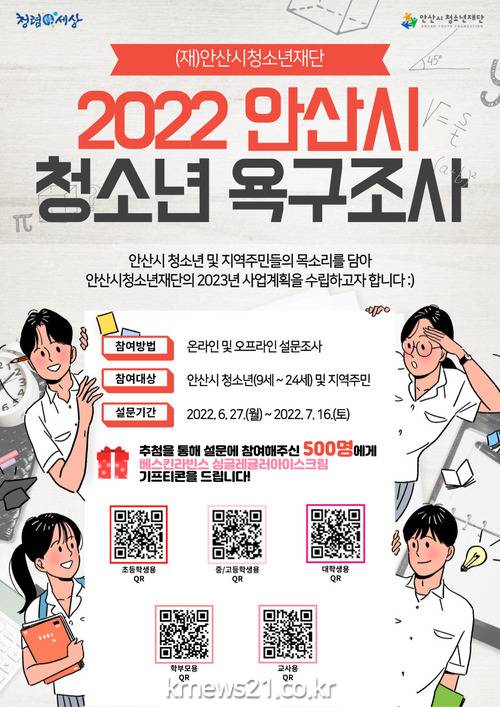 부좌현 안산시청소년재단 대표는 “다양한 목소리를 반영해 더 좋은 청소년 활동 프로그램과 청소년 정책을 만들어 갈 수 있도록 이번 조사에 적극 참여해 주시길 당부드린다”고 말했다.