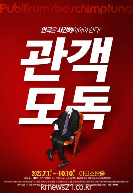 관객모독은 2019년 노벨문학상을 수상한 오스트리아 태생의 극작가 페터 한트케(Peter Handke)의 대표적인 희곡으로, 1978년 극단 76의 기국서 연출에 의해 공연된 이후 연일 매진 행렬을 이어온 극단 76의 레퍼토리 공연이다.