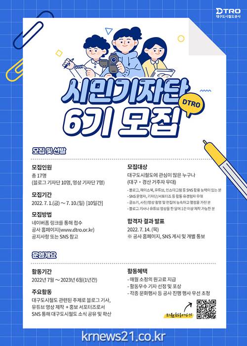 ▲ 사진=대구광역시대구도시철도공사는 페이스북·블로그·유튜브·인스타그램 등 공사 SNS를 통해 도시철도와 관련한 다양한 소식을 전할「제6기 DTRO 시민기자단」을 모집한다고 밝혔다.