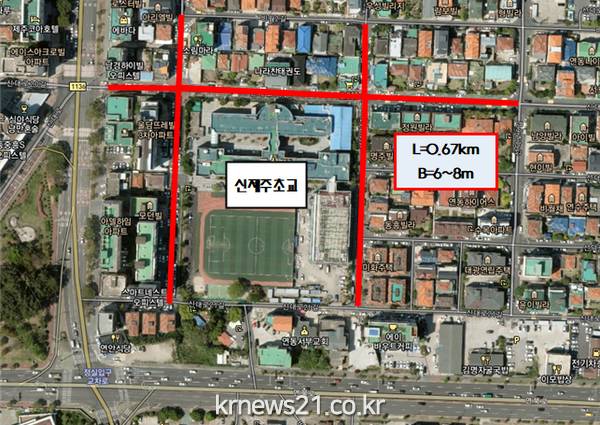이에 제주시는 지난 2020. 10. 26. 한국전력공사와 협약을 체결한 뒤 총사업비 14억원(공사비 4억원, 지중화 분담금 10억)을 투입해 신제주초교 주변 일원(총연장 L=0.67km)에 대한 전신주 제거와 도로 정비공사를 시행했다.