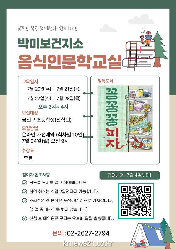 모집인원은 총 40명으로 금천구 초등학교에 재학 중이라면 참여할 수 있다. 7월 4일부터 18일까지 선착순으로 모집하며, 박미보건지소 밴드를 통해 또는 홍보물의 QR코드를 인식해 참가신청서를 제출할 수 있다.