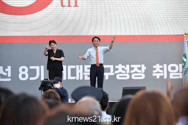 ▲ 사진=서대문구청이성헌 서대문구청장이 7월 1일 오후 홍제3동 인왕시장 앞에서 민선 8기 구정을 여는 취임식을 가졌다.