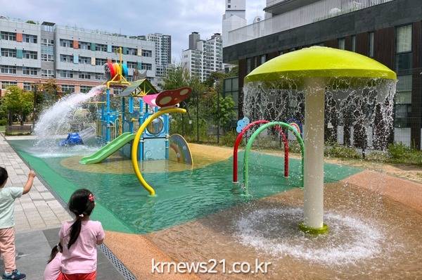이들 물놀이장은 미끄럼틀 같은 놀이시설과 함께 이용할 수 있는 것이 특징이며 작은 물 폭포도 가동돼 어린이들의 즐거움을 더한다. 구는 여름철 이 같은 활용을 감안해 이들 공원을 만들었다.