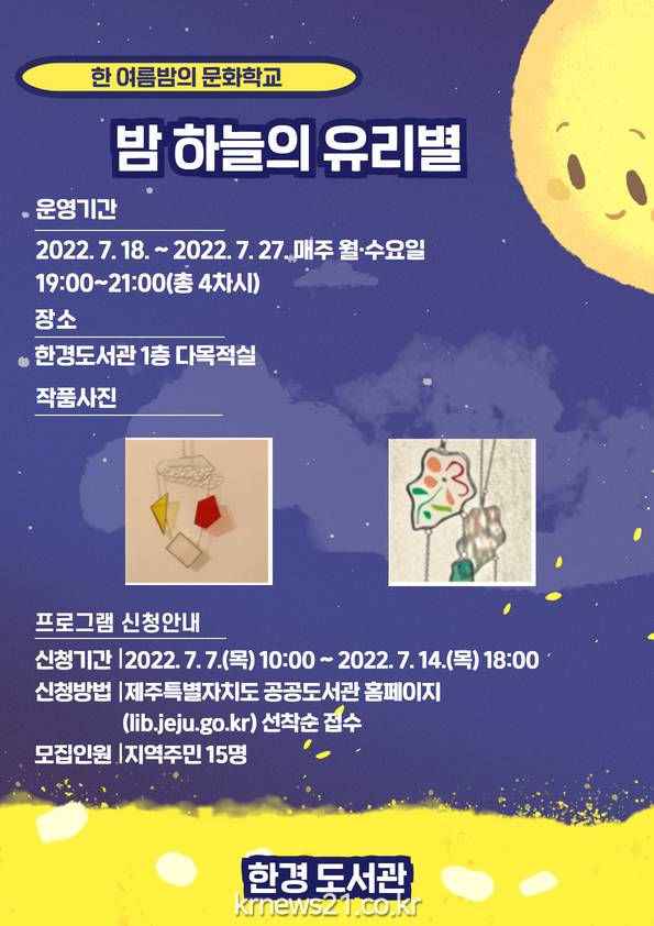 <밤 하늘의 유리별>은 오는 7월 18일부터 27일까지 매주 월· 수요일 19:00~21:00, 한경도서관 1층 다목적실에서 지역주민을 대상으로 진행된다.