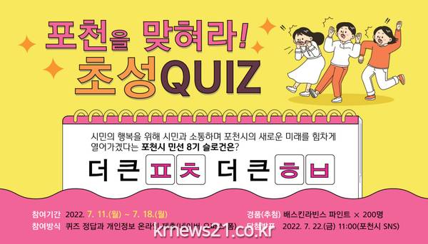 기간은 7월 11일부터 18일까지로, 참여방법은 시민의 행복을 위해 시민과 소통하며 포천시의 새로운 미래를 힘차게 열어가겠다는 포천시 민선8기 슬로건의 빈칸 초성을 네이버 폼(https://naver.me/G8mFmyPz)에 입력하면 된다.