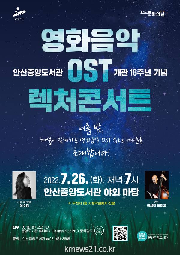 접수는 안산시 중앙도서관 누리집(http://lib.ansan.go.kr)에서 선착순으로 100명까지 가능하며 안산시 유튜브 실시간 생중계를 통해 온라인으로도 즐길 수 있다.