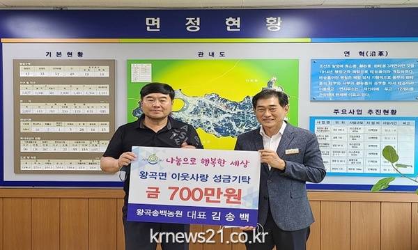 강득원 왕곡면장은 “지역사회 발전과 이웃과의 나눔을 묵묵히 지속해온 김송백 대표께 감사드린다”며 “기탁자의 뜻에 따라 생활이 어려운 저소득 주민 가구를 위해 소중히 사용하겠다”고 말했다.
