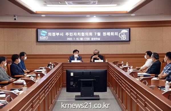 의정부시(시장 김동근) 주민자치협의회(회장 박범서)는 7월 18일 14개 동의 주민자치회장으로 구성된 주민자치협의회 정례회의를 개최했다. 이날 회의에는 김동근 의정부시장이 참석해 의정부시 주민자치 발전을 위해 심도 있는 토론을 실시했다.