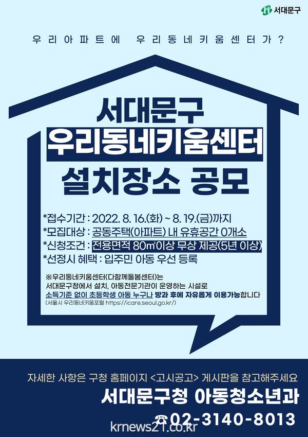 이성헌 서대문구청장은 “초등학생 자녀들이 집 가까운 곳에서 안전하고 편리하게 돌봄시설을 이용할 수 있도록 이번 우리동네키움센터 공모에 아파트 주민 분들의 많은 관심과 참여를 부탁드린다”고 말했다.