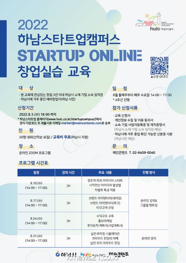 □ 교육은 8월 10일부터 31일까지 하남시의 지원으로 전액 무료로 진행되며 약 1만 명 이상의 예비창업가를 교육한 창업 전문 에듀테크 기업 메인콘텐츠가 ZOOM을 활용하여 온라인으로 운영한다.