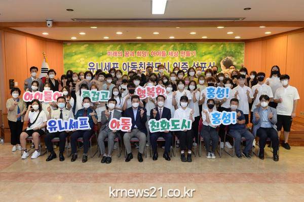 지난 25일 홍성군청에서 이용록 홍성군수를 비롯해 이선균 홍성군의회 의장과 군의원, 아동친화도시 추진위원, 아동참여위원회 위원, 아동 단체 등 100여 명이 참석한 가운데 유니세프 아동친화도시 인증 선포식과 현판 제막식을 개최했다.