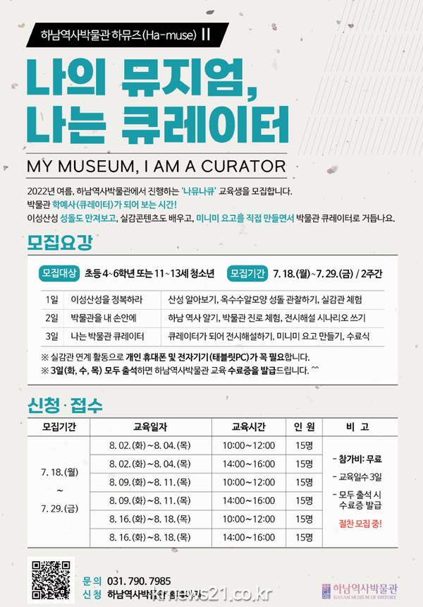 첫 번째 교육프로그램은 「나의 뮤지엄, 나는 큐레이터」이다. 대상은 초등학교 4~6학년 또는 동일 연령의 청소년으로, 2021년 3월 개관한 이성산성 실감관을 비롯한 상설전시 연계 교육이다. 2022. 8. 2.(화)부터 2022. 8. 18.(목)까지 3주간 진행하는데, 사흘에 걸쳐 총 6시간을 이수하게 된다. 1일차에는 ‘이성산성을 정복하라’라는 주제로 산성에 대한 역사 교육, 성돌 및 실감관 체험을 진행한다. 2일차와 3일차는 ‘박물관을 내 손안에’, ‘나는 박물관 큐레이터’를 테마로 지역사 교육, 진로 체험, 전시해설 시연, 미니미 요고 제작 등의 교육을 예정하고 있다. 수강생은 개인 휴대폰 또는 태블릿 지참이 필수사항이며, 모두 출석할 경우 수료증을 발급한다. 수강료는 무료이다.