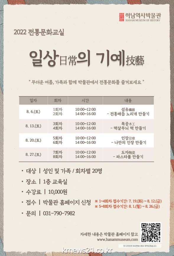두 번째는 「일상(日常)의 기예(技藝)」로서 우리나라 전통문화에 대한 이해와 이를 바탕으로 한 전통 공예 교육프로그램이다. 교육기간은 2022. 8. 6.(토) ~ 8. 27.(토)까지 4주간 이어지며, 매주 토요일 10시, 14시 2회씩 총 8회로 구성된다. 1주 차에는 섬유공예 중 노리개, 2주차부터는 각각 목공예(떡살), 인장공예(인장), 도자공예(파스타볼) 체험을 진행한다. 대상은 성인 또는 가족 단위로 접수한다. 수강료는 10,000원이다.