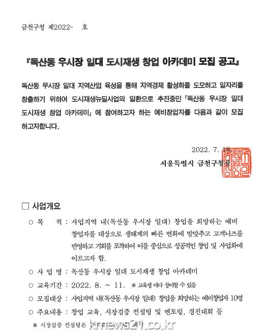 ▲ 사진=금천구 공고문 캡처금천구(구청장 유성훈)는 8월 5일까지 ‘독산동 우시장 도시재생 창업아카데미’에 참여할 예비창업자 10명을 모집한다.
