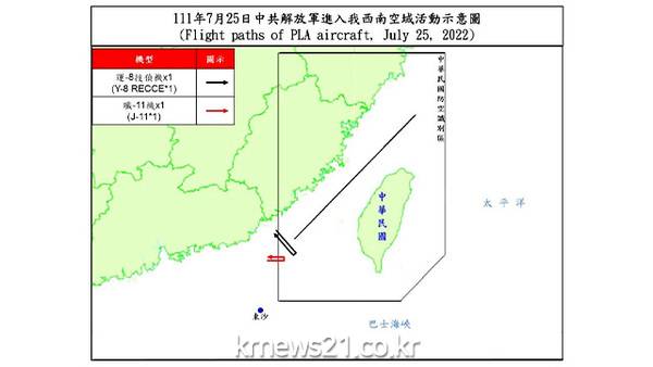 타이완 국방부는 한광훈련 첫날인 지난 25일 오전 10시쯤 중국의 미사일 구축함 한 척이 란위(蘭嶼) 섬(오키드 아일랜드)에서 88㎞ 떨어진 해상을 항해했다고 발표했습니다. 타이완 국방부는 같은 날 오후 3시 30분께 란위섬 동쪽 92㎞ 해상에서 인민해방군 구축함 한 척이 북쪽으로 항해하는 장면을 포착했고, 오후 4시에는 뤄다오 북동쪽 해상 102㎞ 지점에서 중국의 해저 음파탐지선 한 척이 항해하는 장면이 탐지됐다.