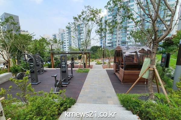 또한 기존 급경사면에 입체화단을 조성하고 운동시설과 음수대, 그네의자가 달린 파고라(정자와 비슷한 휴게시설) 등을 설치했다.